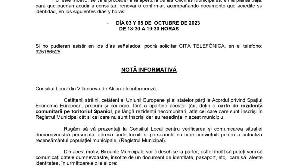 Ante la necesidad de actualizar el padrón municipal, el Ayuntamiento de Villanueva de Alcardete, informa a los ciudadanos extranjeros