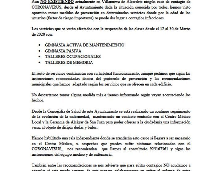 Aun NO EXISTIENDO actualmente en Villanueva de Alcardete ningún caso de contagio de CORONAVIRUS, desde el Ayuntamiento dada la situación conocida por todos, hemos visto oportuno tomar medidas de prevención en determinados servicios donde por la edad de los usuarios (factor de riesgo importante) se puede dar lugar a contagios infecciosos.
