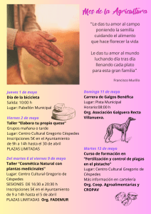 Esta agenda es un homenaje a San Isidro y a todos los agricultores y agricultoras, especialmente los de nuestro pueblo, en ella se recogen un montón de actividades con las que hemos intentado llegar a todas las edades. Mayores, jóvenes y niños podrán participar y disfrutar de un mes de mayo cargadito.