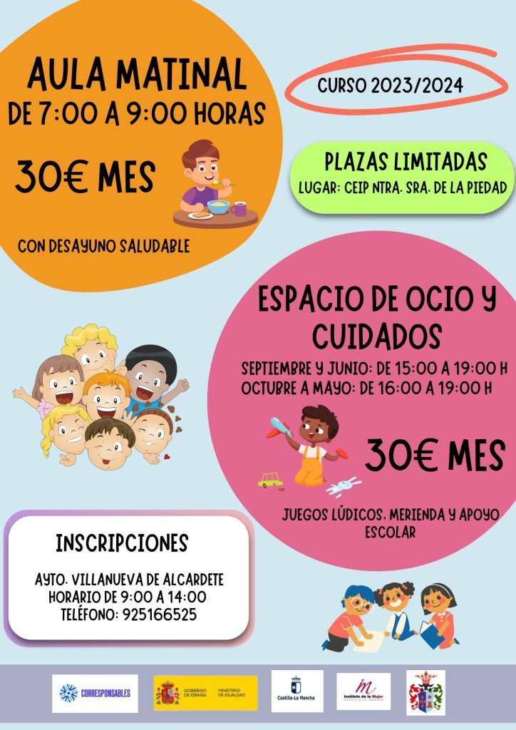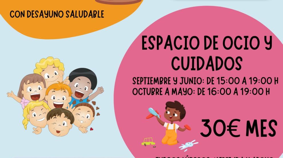 Espacio de ocio y cuidados, en los meses de Septiembre y Junio de 15 h a 19 h y los meses de Octubre a Mayo el horario es de 16 h a 19 h el coste por mes 30 €.