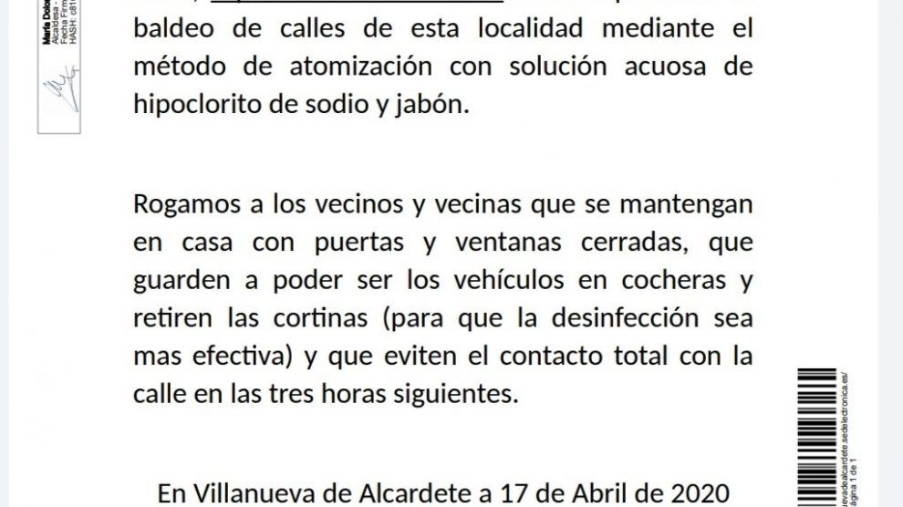 Se comunica a los vecinos y vecinas de este pueblo que durante esta noche de Viernes 17 de Abril de 2020, a partir de las 21 horas se va a proceder al baldeo de calles de esta localidad mediante el método de atomización con solución acuosa de hipoclorito de sodio y jabón.