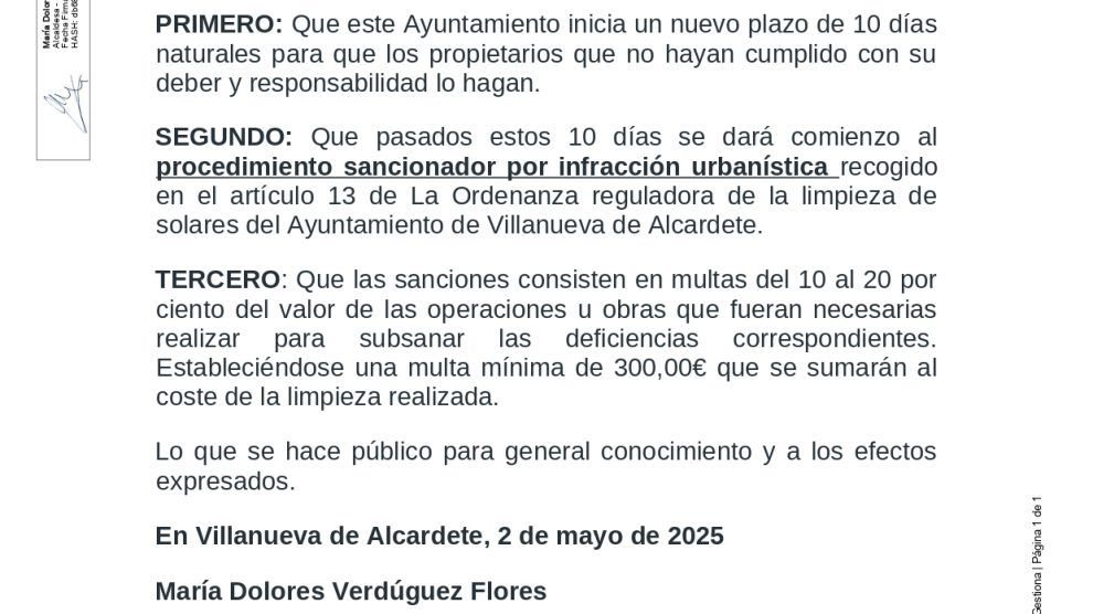 SEGUNDO: Que pasados estos 10 días se dará comienzo al procedimiento sancionador por infracción urbanística recogido en el artículo 13 de La Ordenanza reguladora de la limpieza de solares del Ayuntamiento de Villanueva de Alcardete.