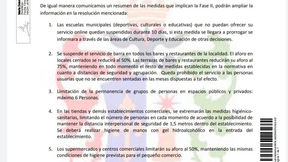 - Se suspende el servicio de barra en todos los bares y restaurantes de la localidad. El aforo en locales cerrados se reducirá al 50%. Las terrazas de bares y restaurantes reducirán su aforo al 75%, manteniendo en todo momento el resto de medidas establecidas en la normativa en cuanto a distancias de seguridad y agrupación. Queda prohibido el servicio a las personas usuarias que no se encuentren sentadas en las mesas dispuestas a tal efecto.