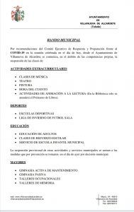 Por recomendaciones del Comité Ejecutivo de Respuesta y Preparación frente al COVID-19 en la reunión celebrada en el día de hoy, desde el Ayuntamiento de Villanueva de Alcardete se comunica, en el ámbito de las competencias propias, la suspensión de las clases de: