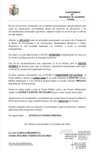 Además se APLAZAN todas las actividades programadas con motivo de la Semana de la Mujer. Se recomiendan a las Asociaciones, Hermandades Religiosas y Clubes Deportivos de esta localidad suspendan sus reuniones y cesen su actividad temporalmente.