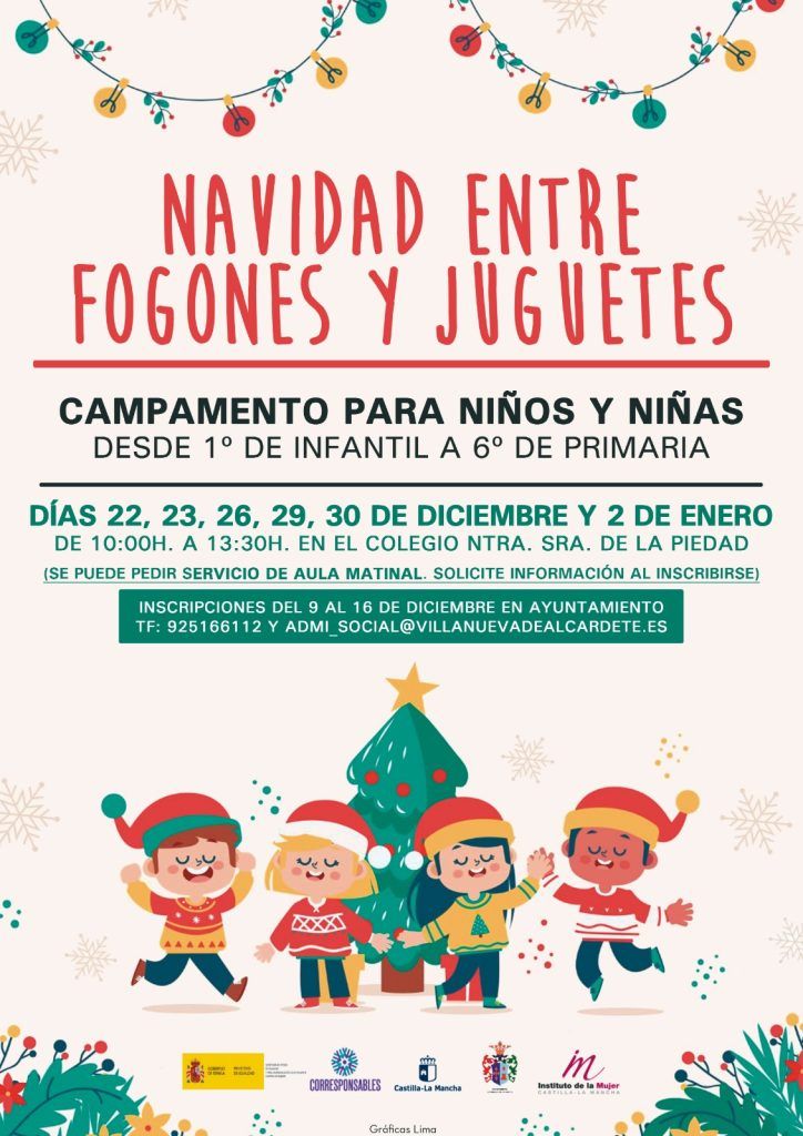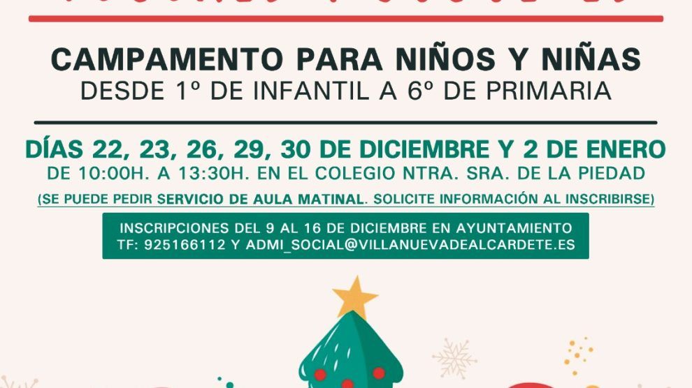Ya esta aquí el campamento de Navidad, ven e inscríbete en el Ayuntamiento del 9 al 16 de diciembre inclusive. Las Inscripciones adjuntas se podrán enviar por email a admi_social@villanuevadealcardete.es o en la oficinas del Ayuntamiento.