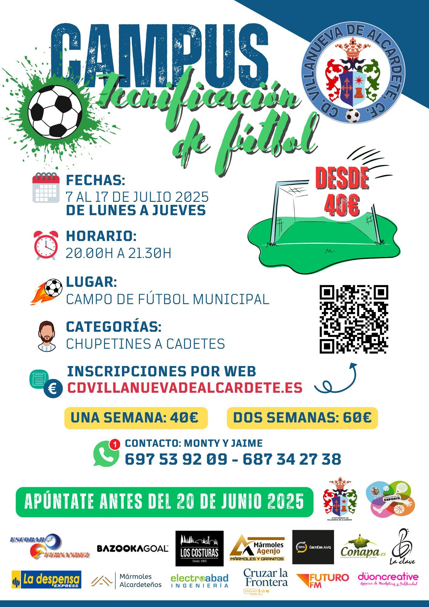 El precio es de 40 euros una semana y 60 euros dos semanas. Se impartirá de Lunes a Jueves en horario de 20:00 a 21:30 horas en el Campo Municipal de Fútbol.