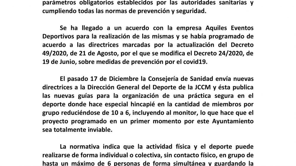 El pasado 17 de Diciembre la Consejería de Sanidad envía nuevas directrices a la Dirección General del Deporte de la JCCM y ésta publica las nuevas guías para la organización de una práctica segura en el deporte donde hace especial hincapié en la cantidad de miembros por grupo reduciéndose de 10 a 6, incluyendo al monitor, lo que hace que el proyecto programado en un primer momento por este Ayuntamiento sea totalmente inviable.