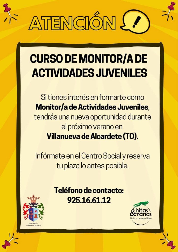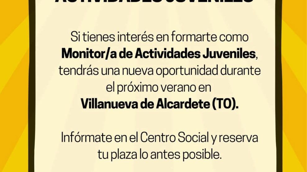 26 marzo, 20253 veces leído Compártelo ! FacebookXLinkedIn General Curso de monitor/a de actividades juveniles. 26 marzo, 20253 veces leído1 min. para leerlo 🔊 Escuchar Anímate a formarte este verano con el curso de monitor/a de actividades juveniles . Más información en el 925166112. Quizás te interese General Biblioteca Pública Municipal de Villanueva de Alcardete permanecerá cerrada durante los días indicados 24 abril, 2026 Empleo y Formación Bases reguladoras para la contratación de personas desempleadas pertenecientes a colectivos vulnerables y en situación de exclusión social – Programa de apoyo activo al empleo, cofinanciadas por el Fondo Social Europeo Plus, de Castilla-La Mancha 2021-2027, Convocatoria 2026. 23 abril, 2026 General TIZADA INFANTIL 22 abril, 2026 Charla de las Actividades de la vida diaria ” Integración sensorial”. Nuevo Programa de Turismo Social de Castilla-La Mancha Compártelo ! FacebookXLinkedIn Síguenos en Redes facebook instagram
