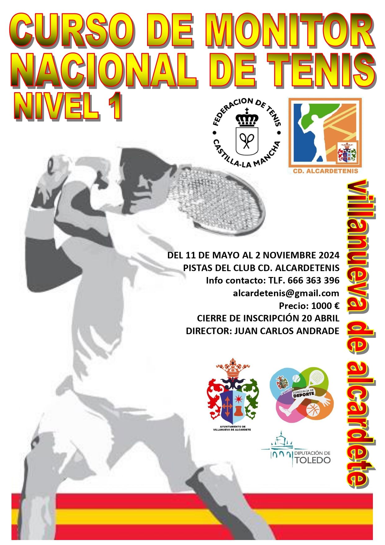 Las fechas para su realización serán desde el 11 de Mayo al 2 de Noviembre de 2024. Las clases prácticas se impartirán en las pistas del CD. Alcardetenis. El precio de curso es de 1000 euros. El plazo de inscripción estará abierto hasta el 20 de Abril.