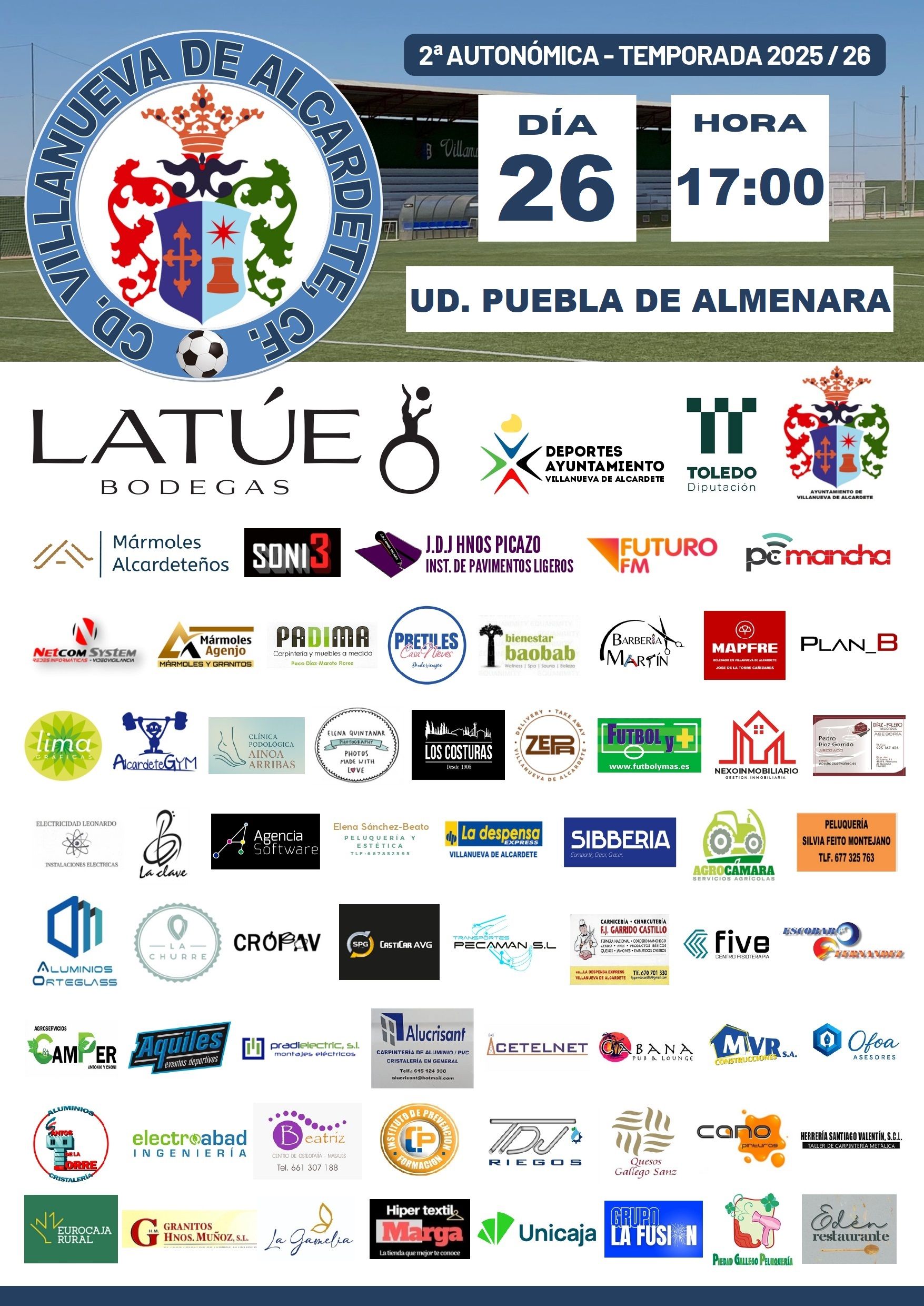 El Domingo, 26 de Abril de 2026, a partir de las 17:00 horas en el Campo Municipal de Fútbol de Villanueva de Alcardete, tendrá lugar la 29ª jornada de competición oficial entre los equipos CD. Villanueva de Alcardete CF.-Bodegas Latúe y UD. Puebla de Almenara.