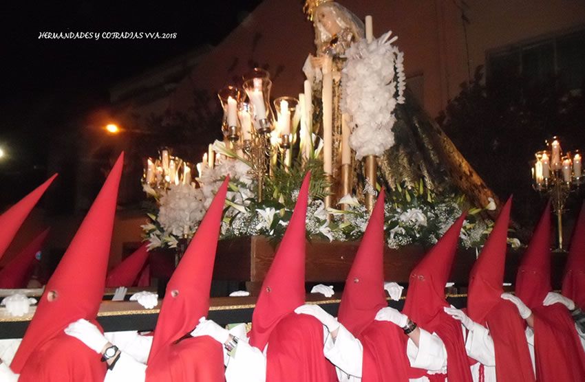 - Vestuario: Habito blanco ceñido a la cintura con cíngulo de lana rojo, capa y capirote rojo.
