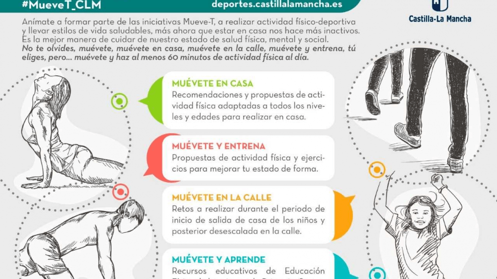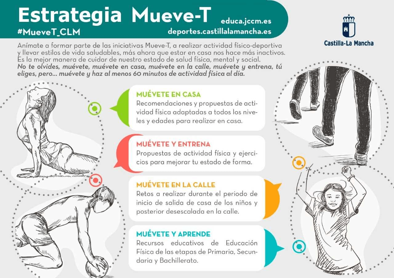 Estos son: Dentro de la Estrategia Mueve-t (Mueve-t en casa y Mueve-t en la calle) y anexo a estos programas, Cuídate en Casa CLM. Os indicamos sus enlaces directos a la web de cada uno de ellos.