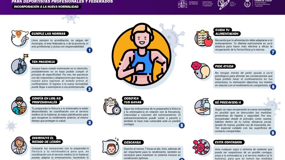 También han publicado un decálogo o guía de recomendaciones deportivas para la vuelta a la nueva normalidad y los protocolos para el reinicio a la competición deportiva, así como un dossier de preguntas más frecuentes relativas a las distintas fases.