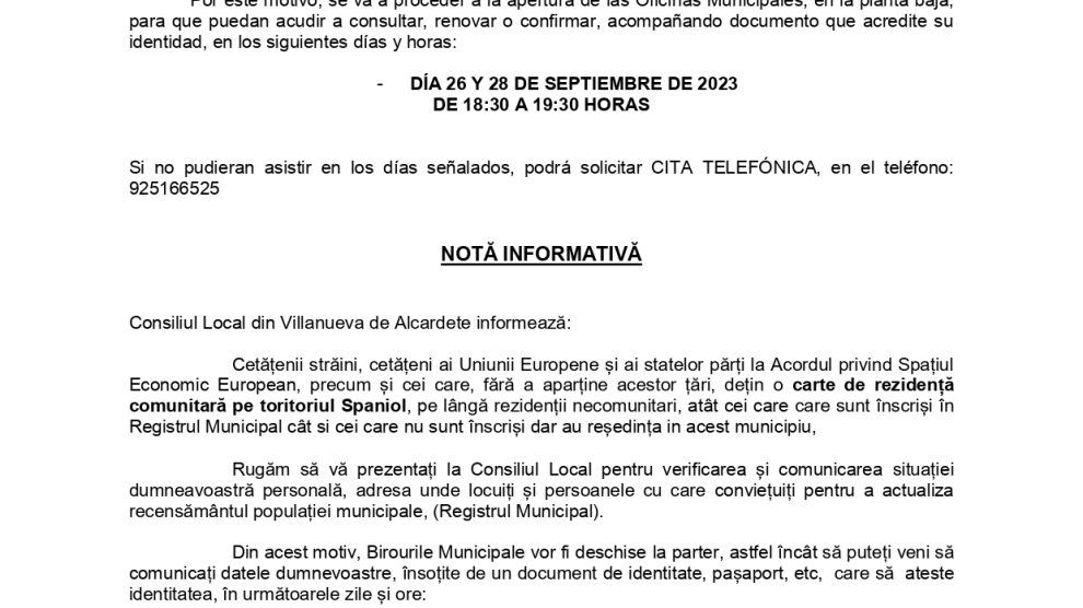El Ayuntamiento de Villanueva de Alcardete, informa a los ciudadanos extranjeros (Ciudadanos de la Unión Europea y de los Estados parte del Acuerdo sobre el Espacio Económico Europeo, así como, los que, sin pertenecer a estos países, tienen tarjeta de residencia de régimen comunitario por ser familiares de comunitarios, además de los extracomunitarios), que figuren inscritos en el Padrón Municipal que deben de proceder a RENOVAR O CONFIRMAR, su inscripción Padronal así como cualquier otra persona conviviente que resida en este municipio.