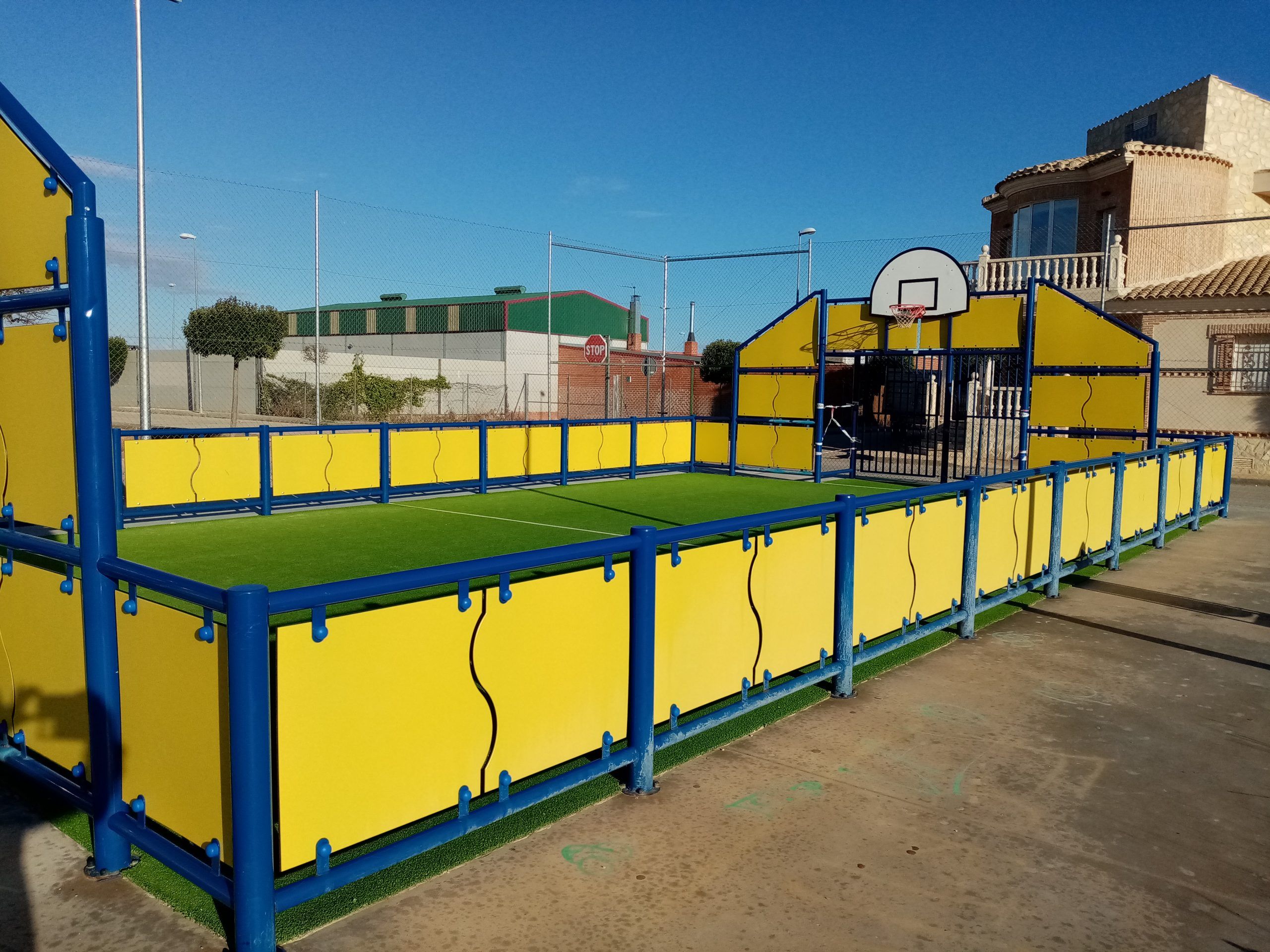 Está decorada sobre fondos amarillos y azules que forman su perímetro con materiales antivandálicos compuestos de madera especial y aluminio. El piso lo conforma una pista de césped artificial de color verde. Está abierta al público y no conlleva ningún coste por su utilización ni alquiler. Dispone de iluminación led para su uso nocturno. Es apta para menores de 12 años.