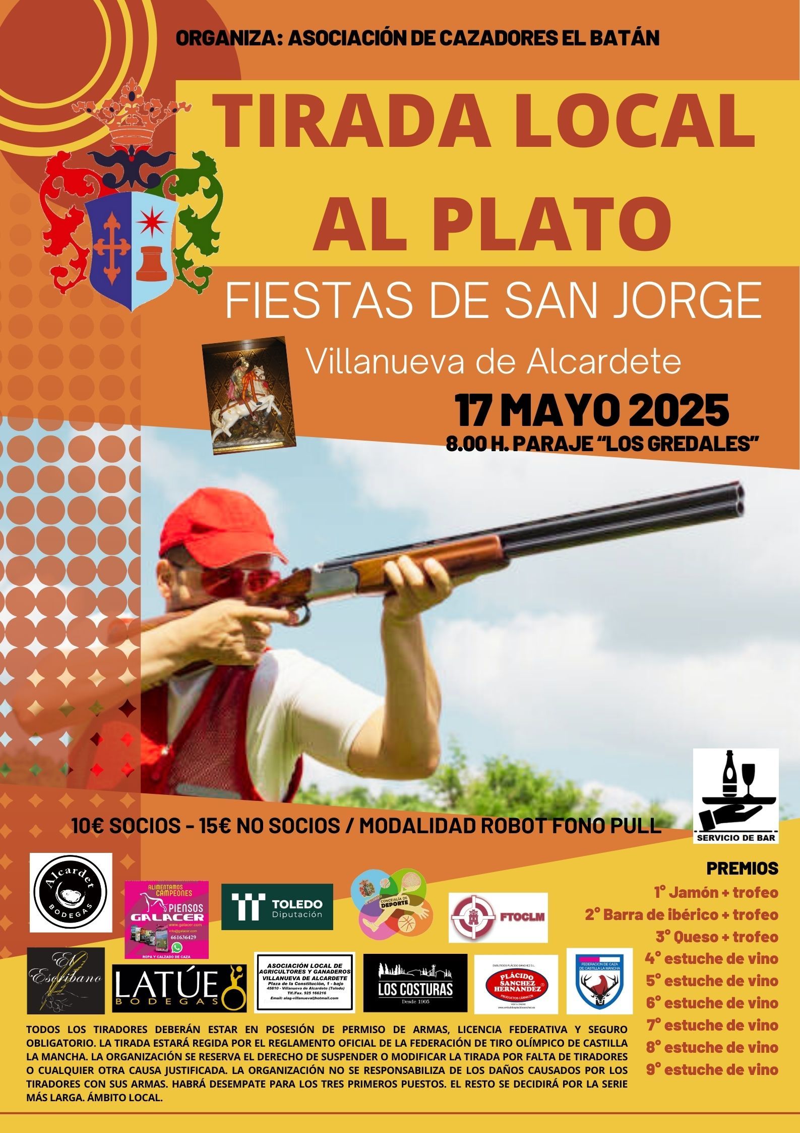 El Sábado, 17 de Mayo, a partir de las 8:00 horas se realizará una nueva Tirada Local al Plato con motivo de las Fiestas de San Jorge en el campo de tiro eventual situado en el paraje de “Los Gredales” (antigua escombrera).