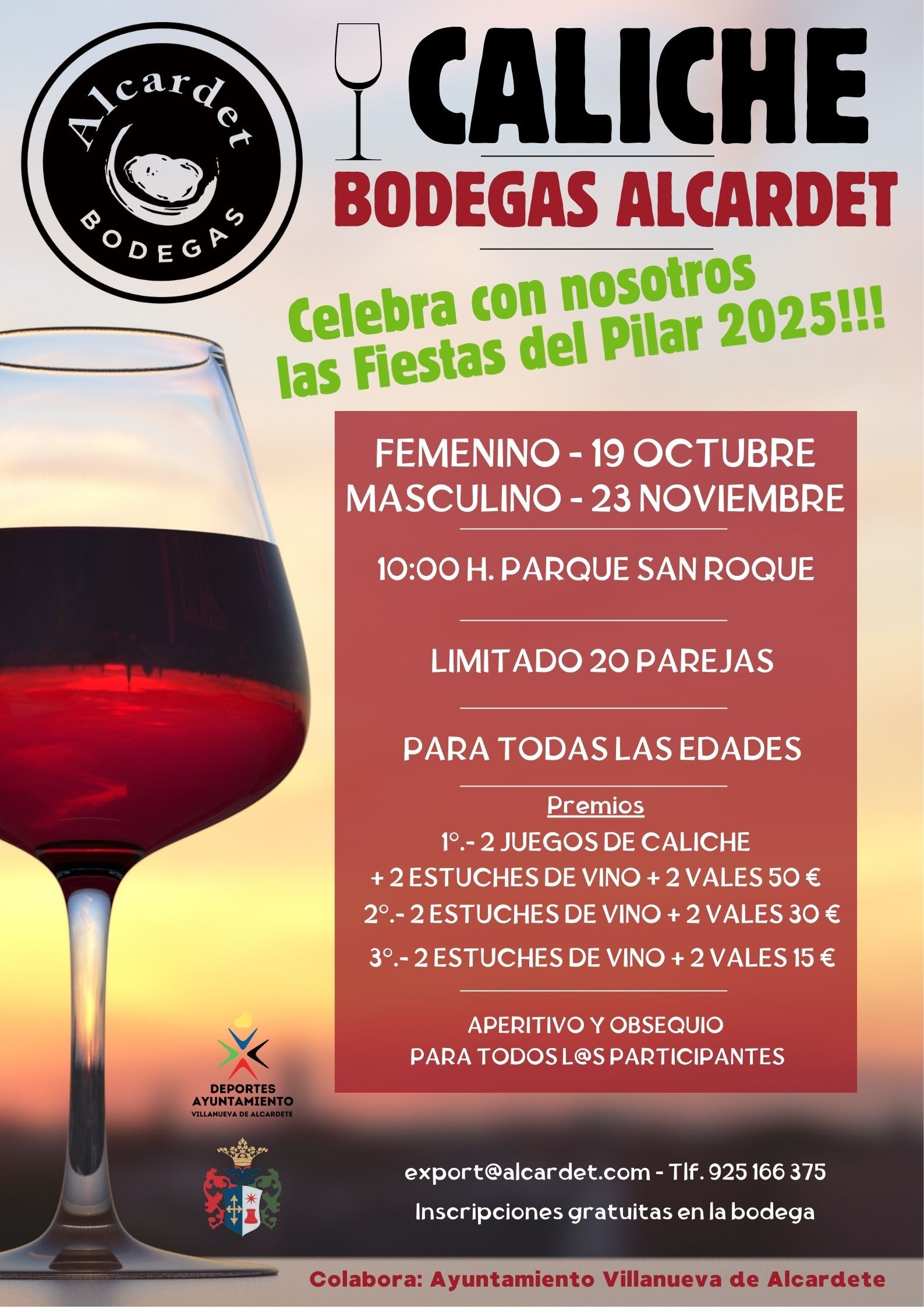 Los Domingos 19 de Octubre y 23 de Noviembre, a partir de las 10:00 horas, en el Parque Municipal San Roque tendrán lugar los torneos de caliche organizados por BODEGAS ALCARDET con motivo de la celebración de las Fiestas del Pilar 2025.