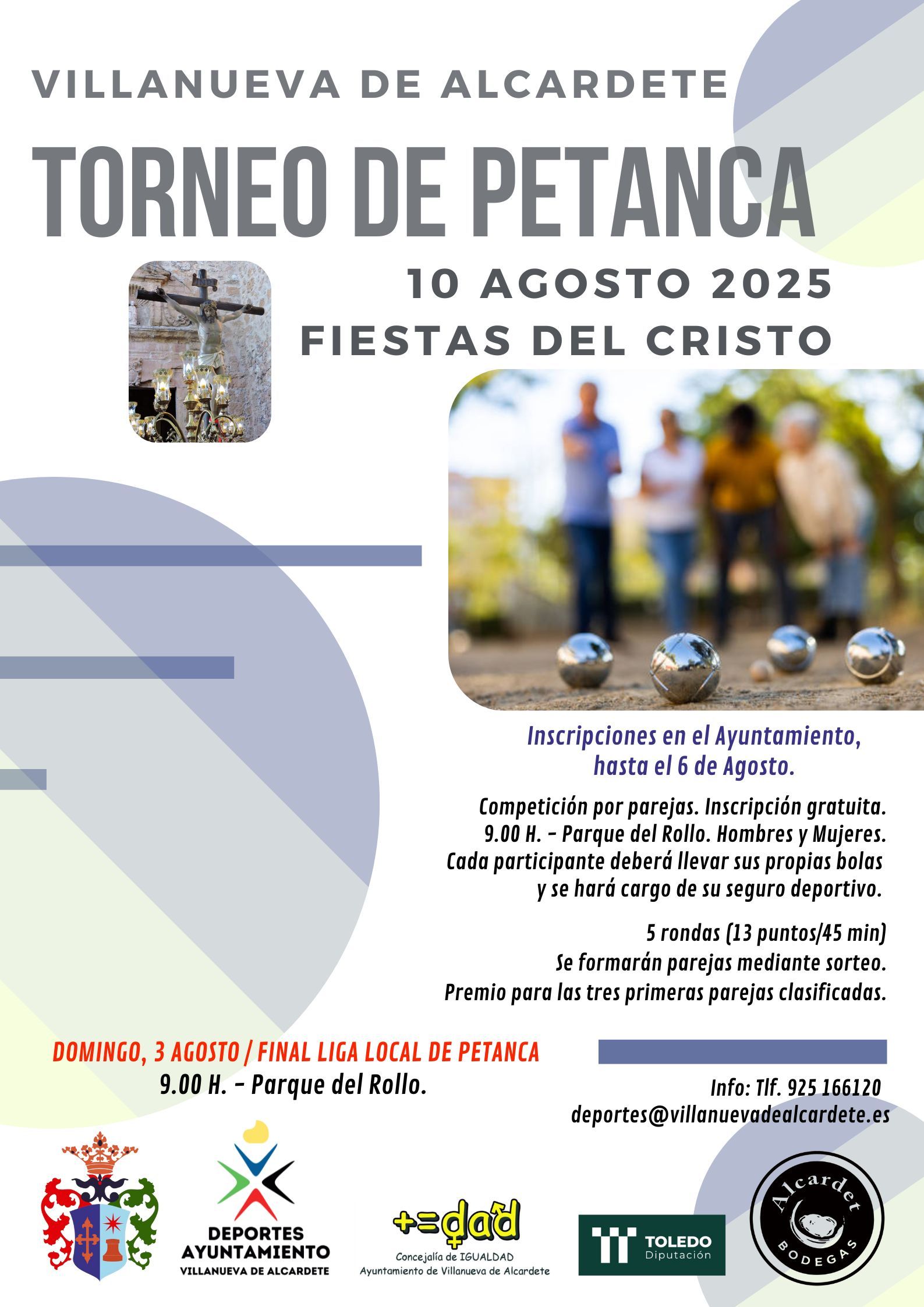 Con motivo de la celebración de las Fiestas del Crist1 en Villanueva de Alcardete se va a celebrar el próximo 10 de Agosto, a partir de las 9:00 horas, el Torneo de Petanca dirigido para hombres y mujeres en la pistas acondicionadas dentro del Parque del Rollo de la localidad.